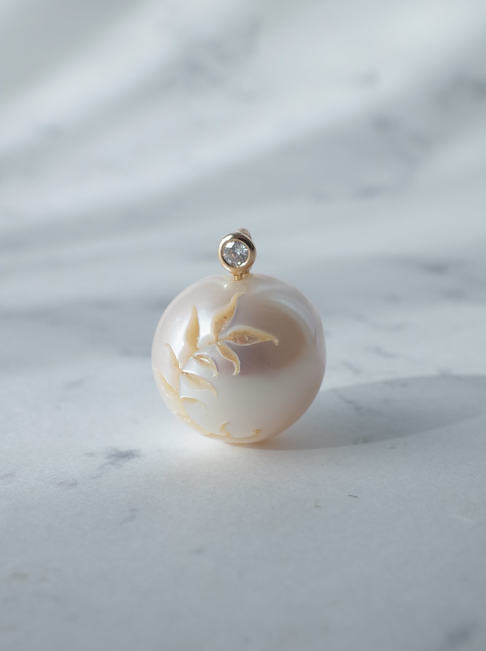 こちらはルネ・ラリックの "シダ" という作品ををモチーフに、オリジナル図案として彫り模様を施したタヒチ真珠のペンダント。 ピーコックカラーのパールに彫られたシダの模様は、インスピレーションとなったラリックの香水瓶を思わせる美しい一点です。
