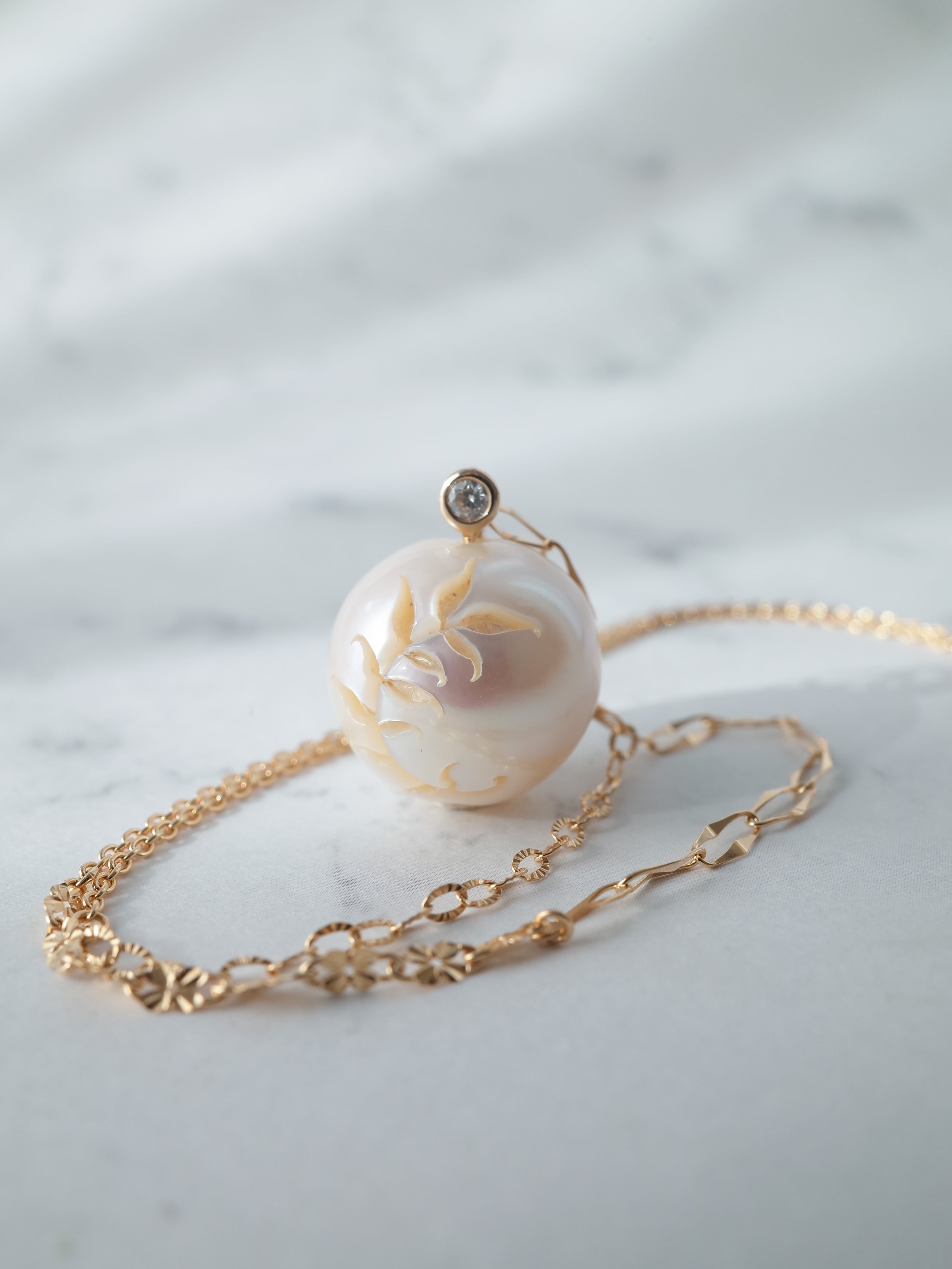 このコレクションは「真珠をキャンバスに絵を描く」をコンセプトに、彫り師が一点一点カービングを施したパールジュエリーです。表面のエクボや傷は、真珠の品質のグレードを下げてしまう要因ですが、人の手によって、海の恵みによって育まれたという事実は他の真珠となんら変わりません。そんなB級品として弾かれてしまう真珠たちにスポットをあて製作されていた職人さんと出会い、デザインの力でもっと多くの方に現状とサスティナブルなものづくりを知っていただくきっかけになればとスタートしました。